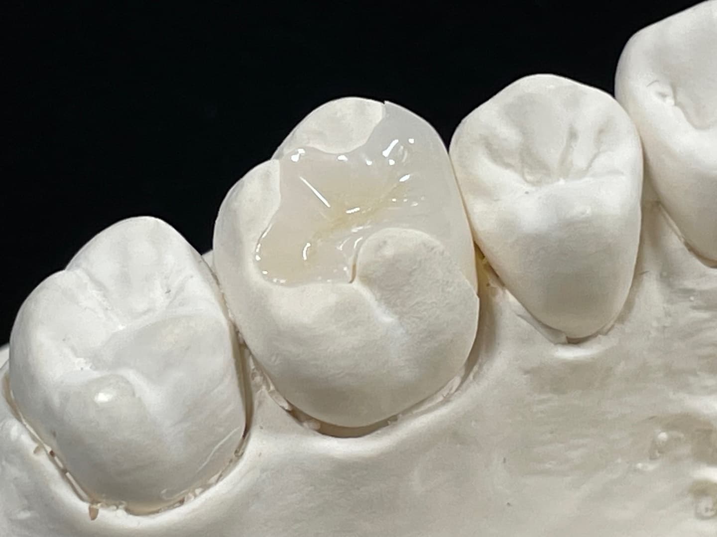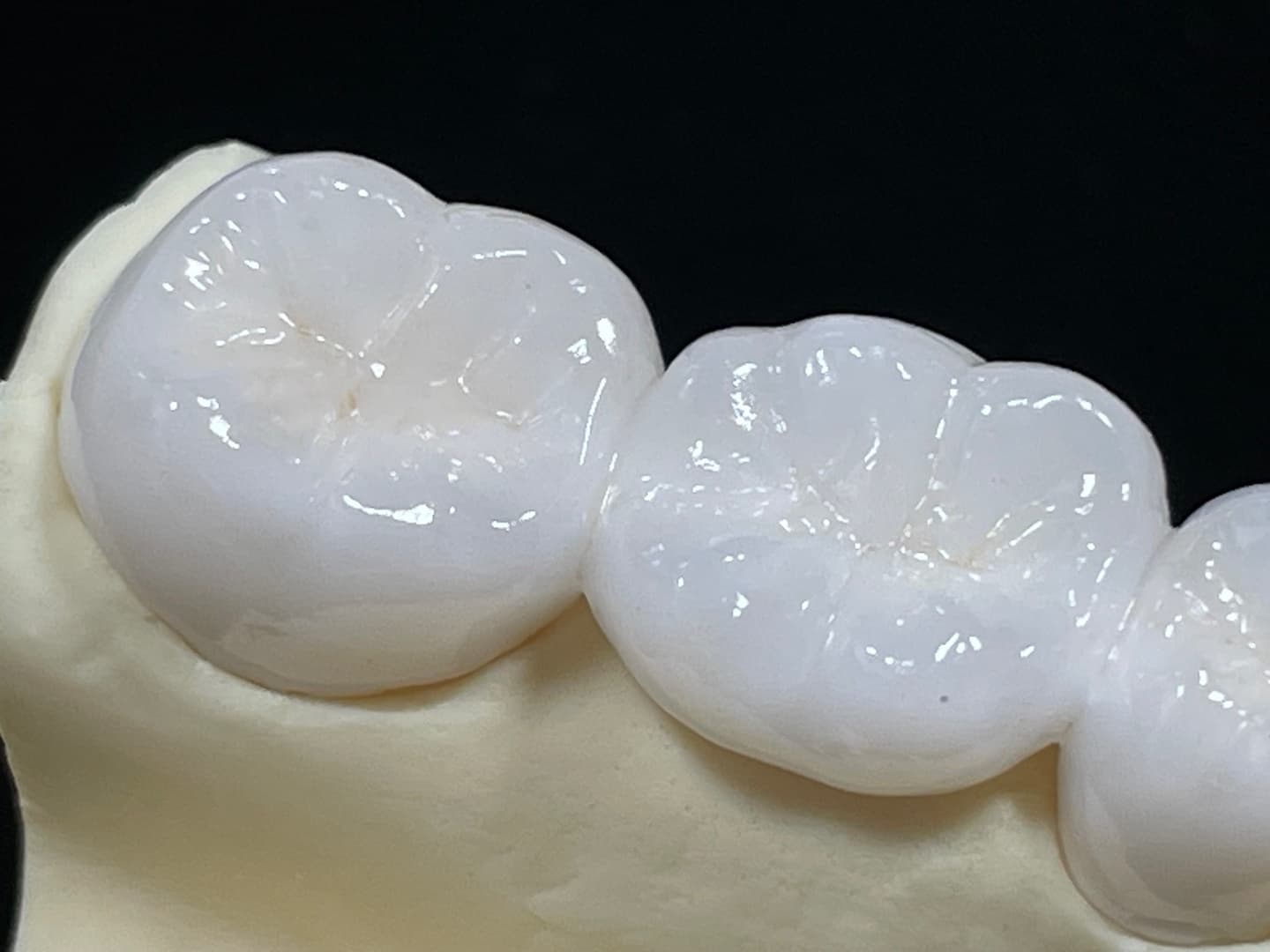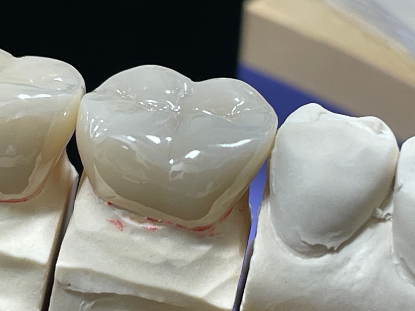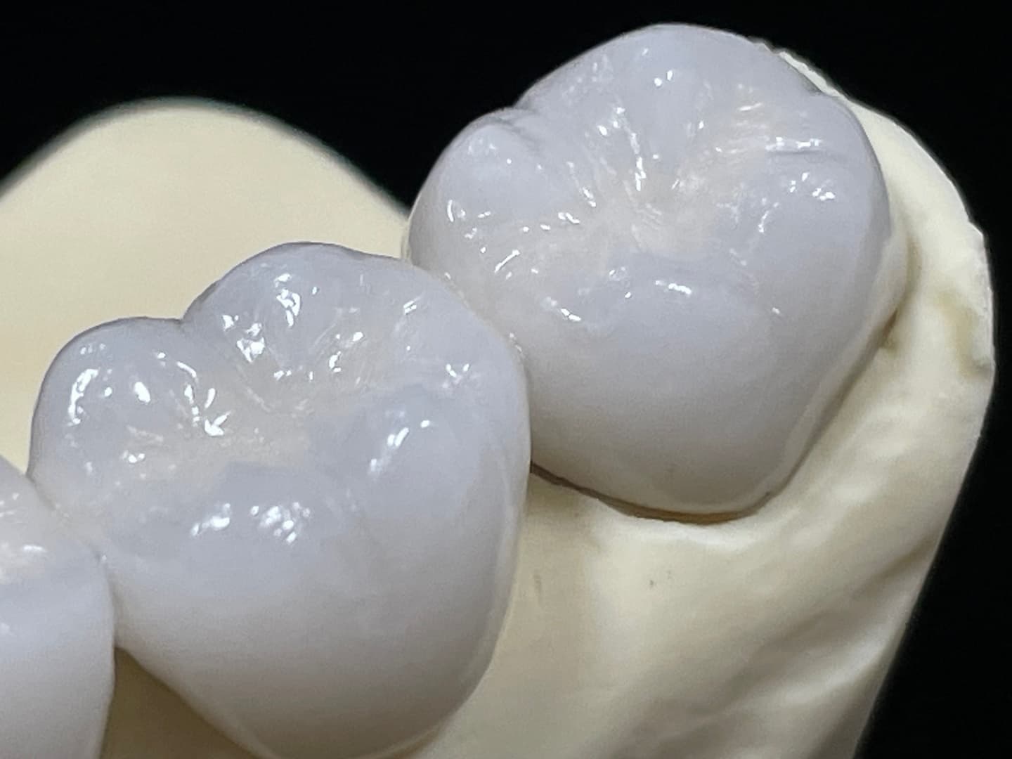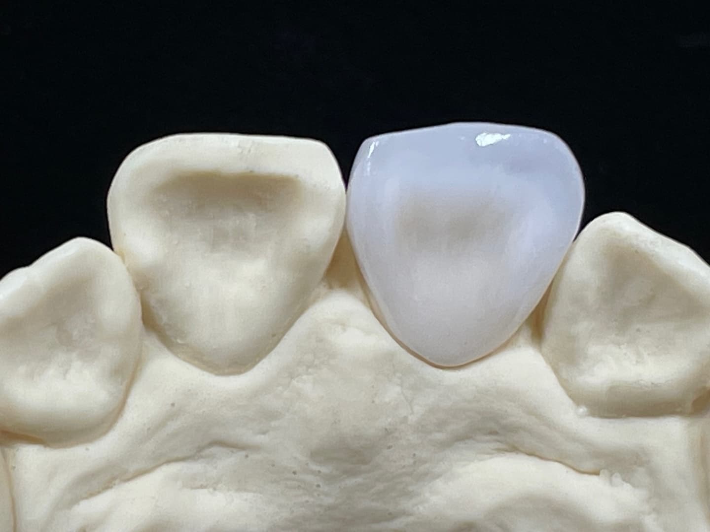 とっても丈夫なガラスセラミック製です。セラミックは生体親和性がとても良い(体になじみやすい)ので、金属アレルギーの心配がありません。天然歯の色調に合わせることができます。