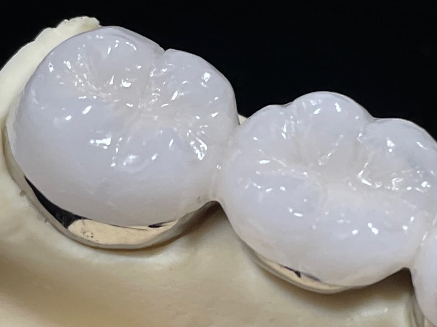 金属のフレーム(メタルキャップ)の上に、セラミック(陶材)を強固に焼き付けて成形されています。金属特有のしなやかさとセラミックの丈夫さを兼ね備えています。金属を裏うちしている関係上、色調再現性や透明感・明るさは、オールセラミックにやや劣ります。特に金属アレルギーの方は使用できません。