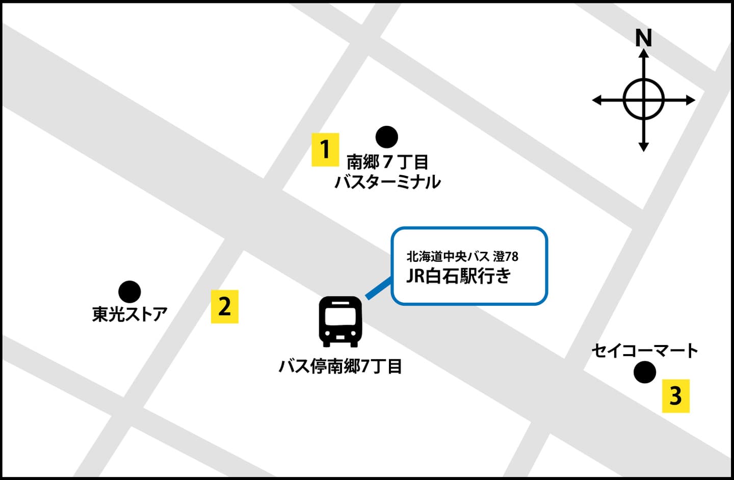 東西線「白石駅」直結の白石バスターミナルから当院近くを経由するバスが出ております。JR白石駅で降りられた方はJR白石駅から徒歩13分で当院に到着できます。北郷2条7丁目・8丁目で降りられた方は徒歩3分で当院に到着できます。