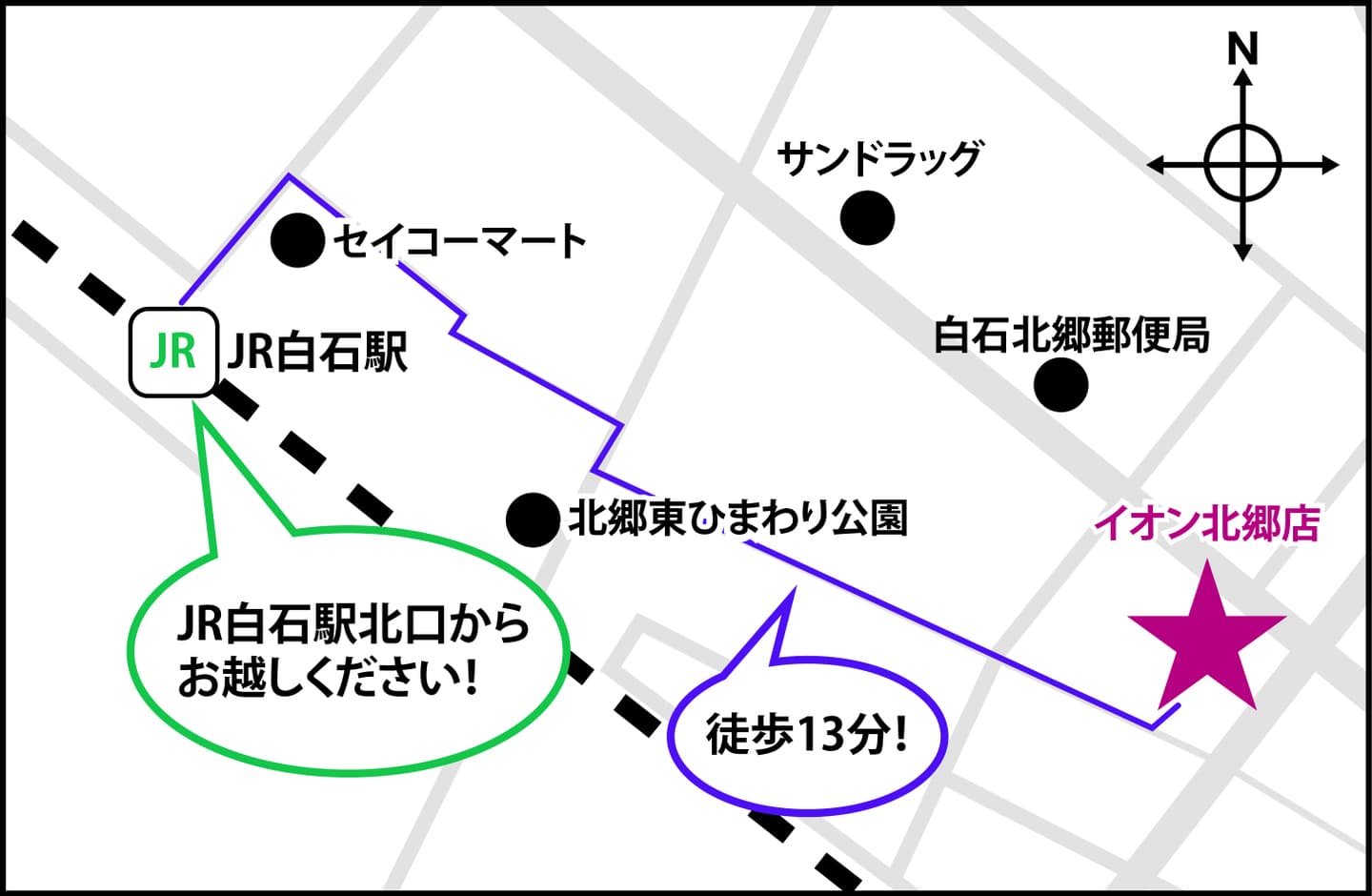 JR白石駅北口を出て徒歩13分で当院に到着できます。