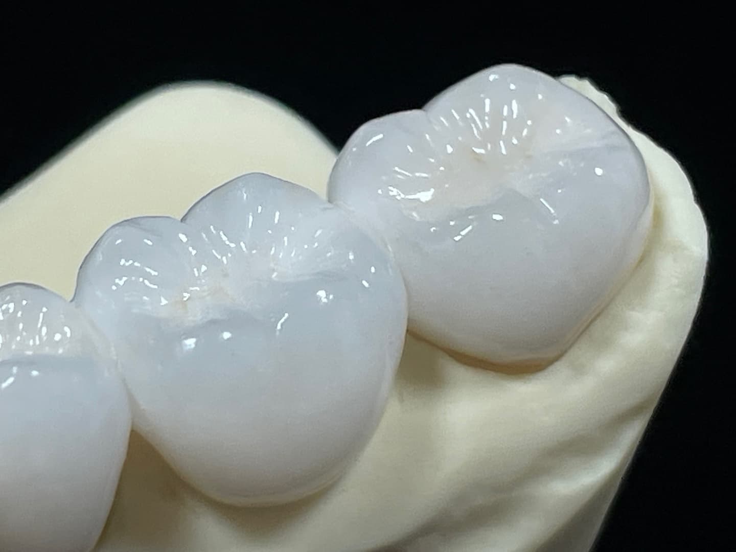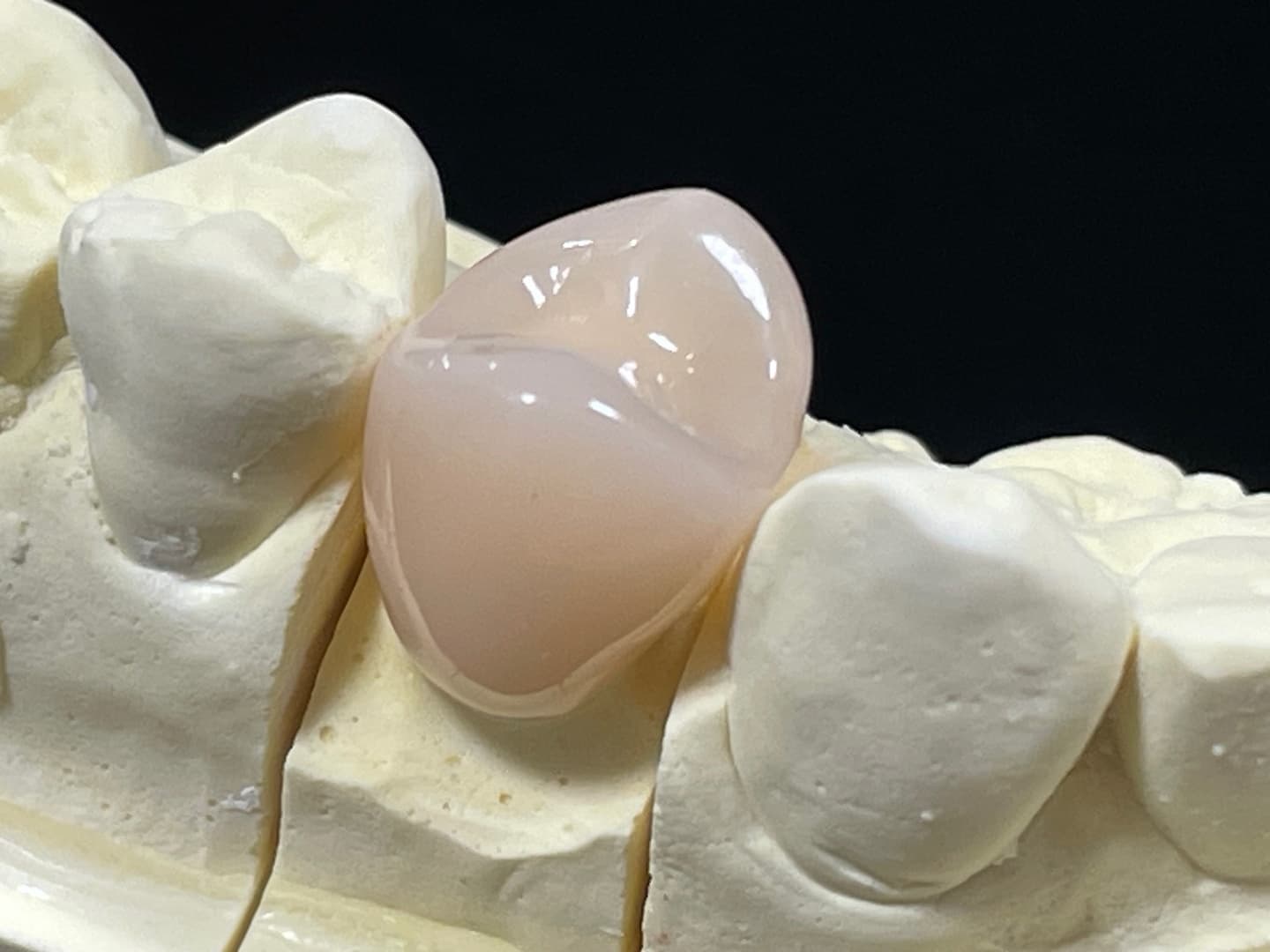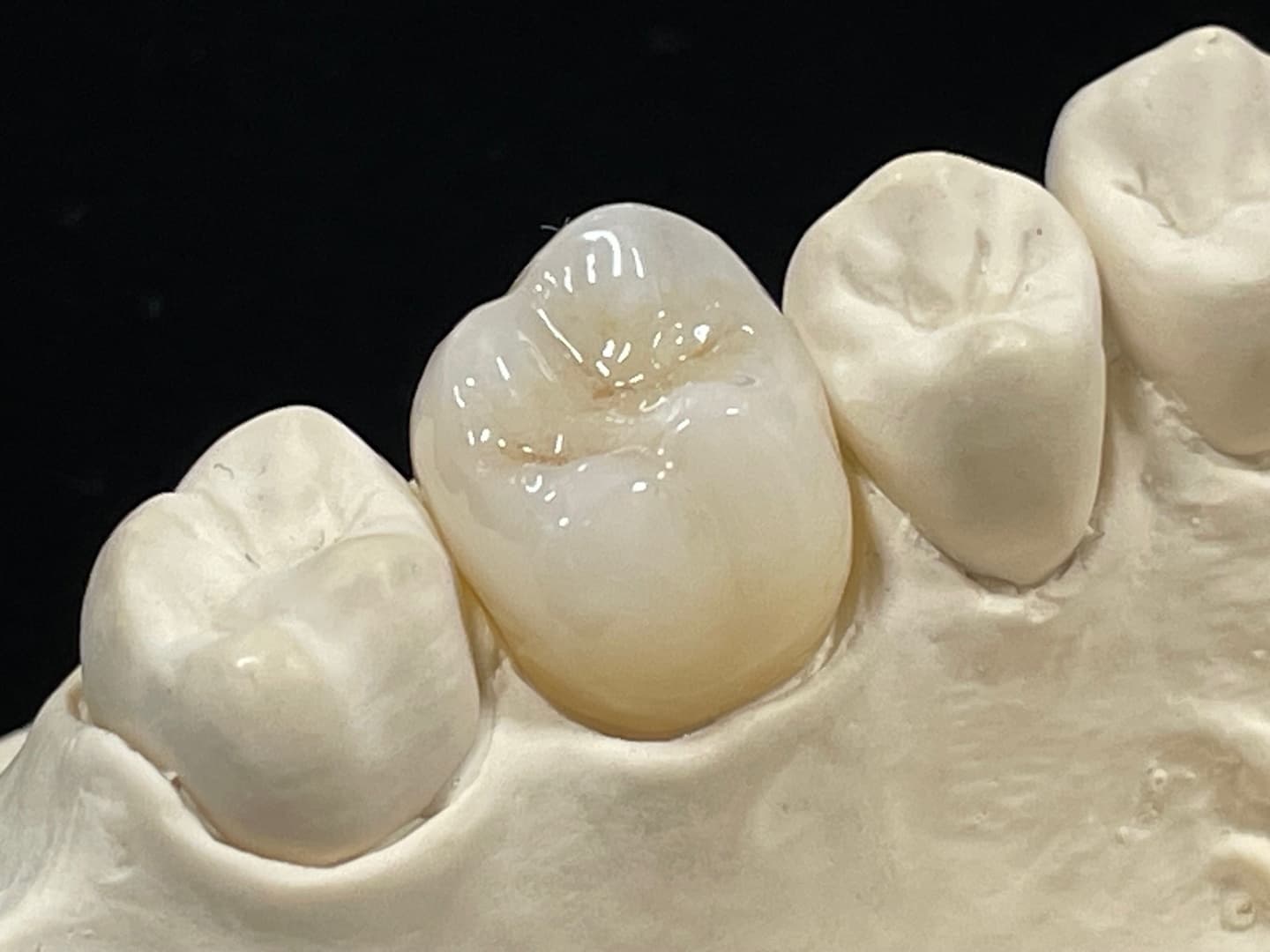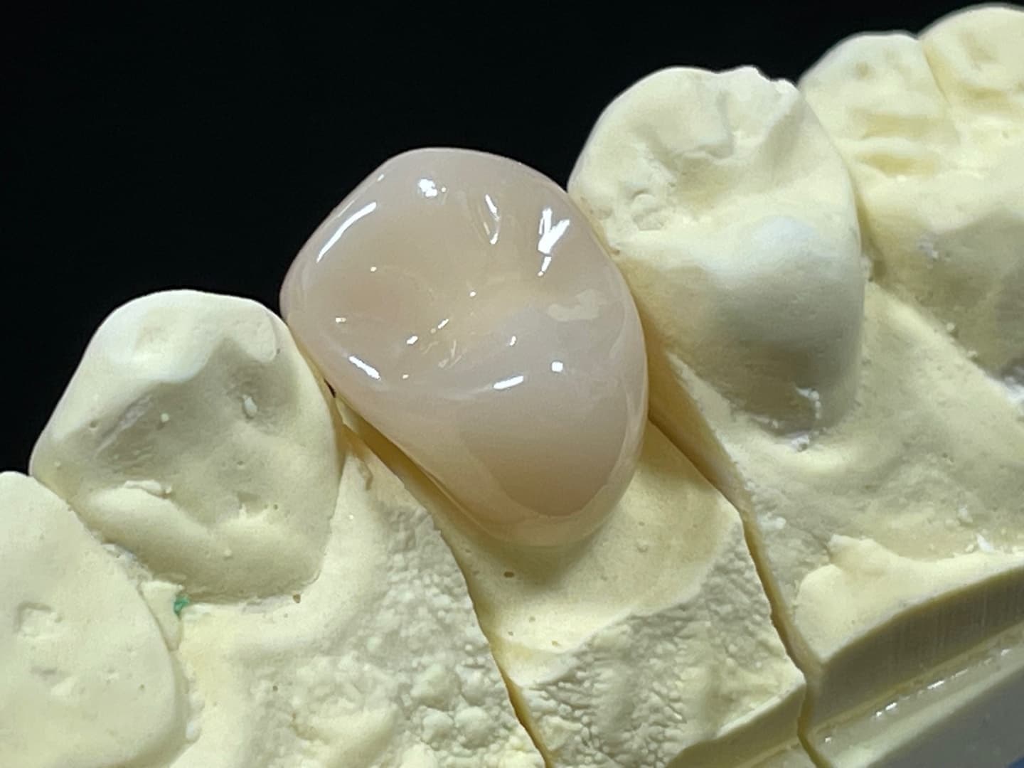 とっても丈夫なガラスセラミック製です。セラミックは生体親和性がとても良い(体になじみやすい)ので、金属アレルギーの心配がありません。天然歯の色調に合わせることができます。