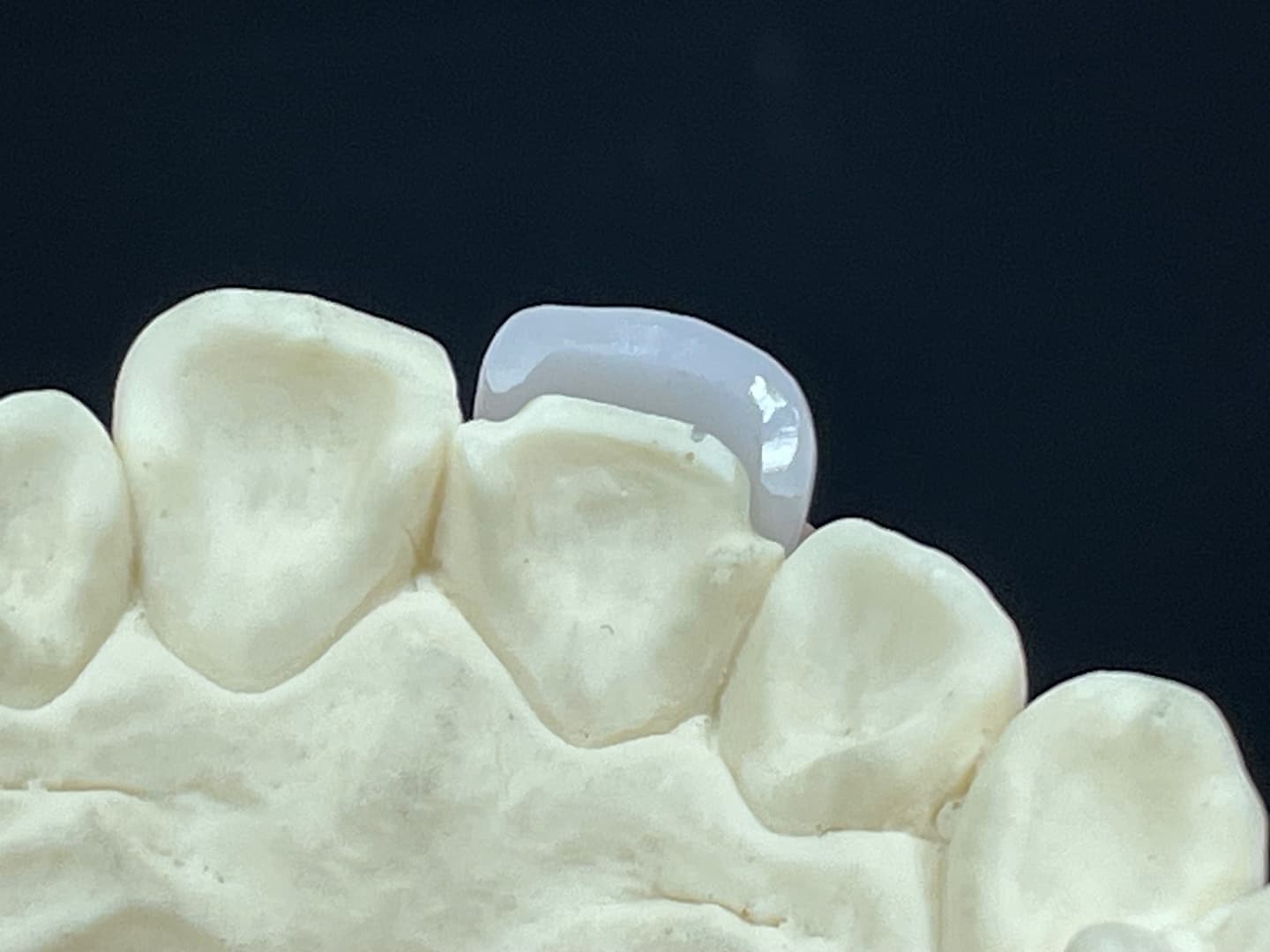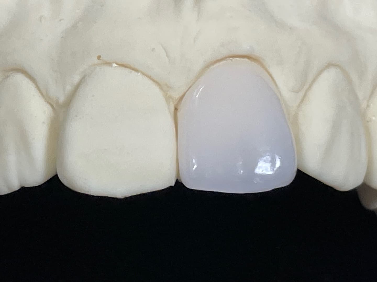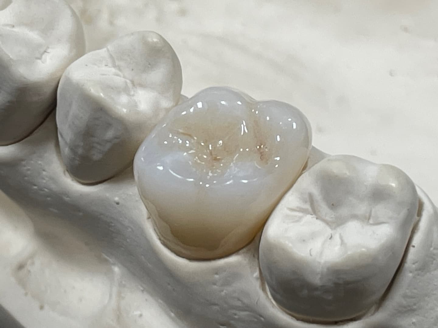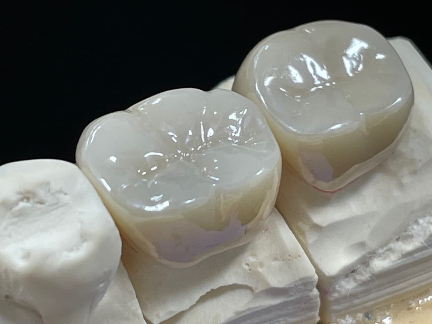 とっても丈夫なガラスセラミック製です。セラミックは生体親和性がとても良い(体になじみやすい)ので、金属アレルギーの心配がありません。天然歯の色調に合わせることができます。