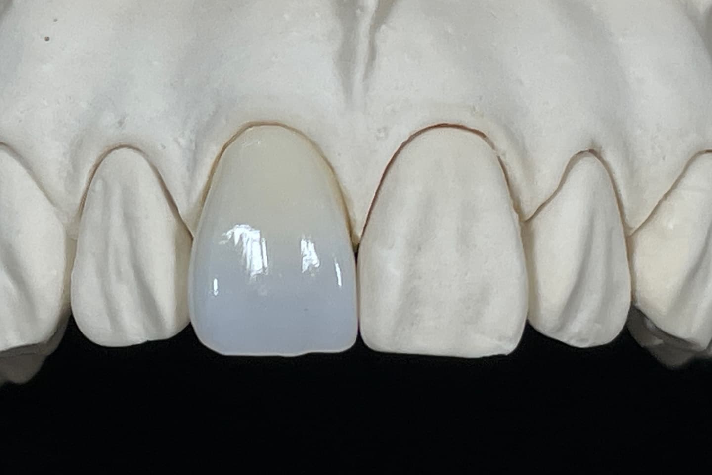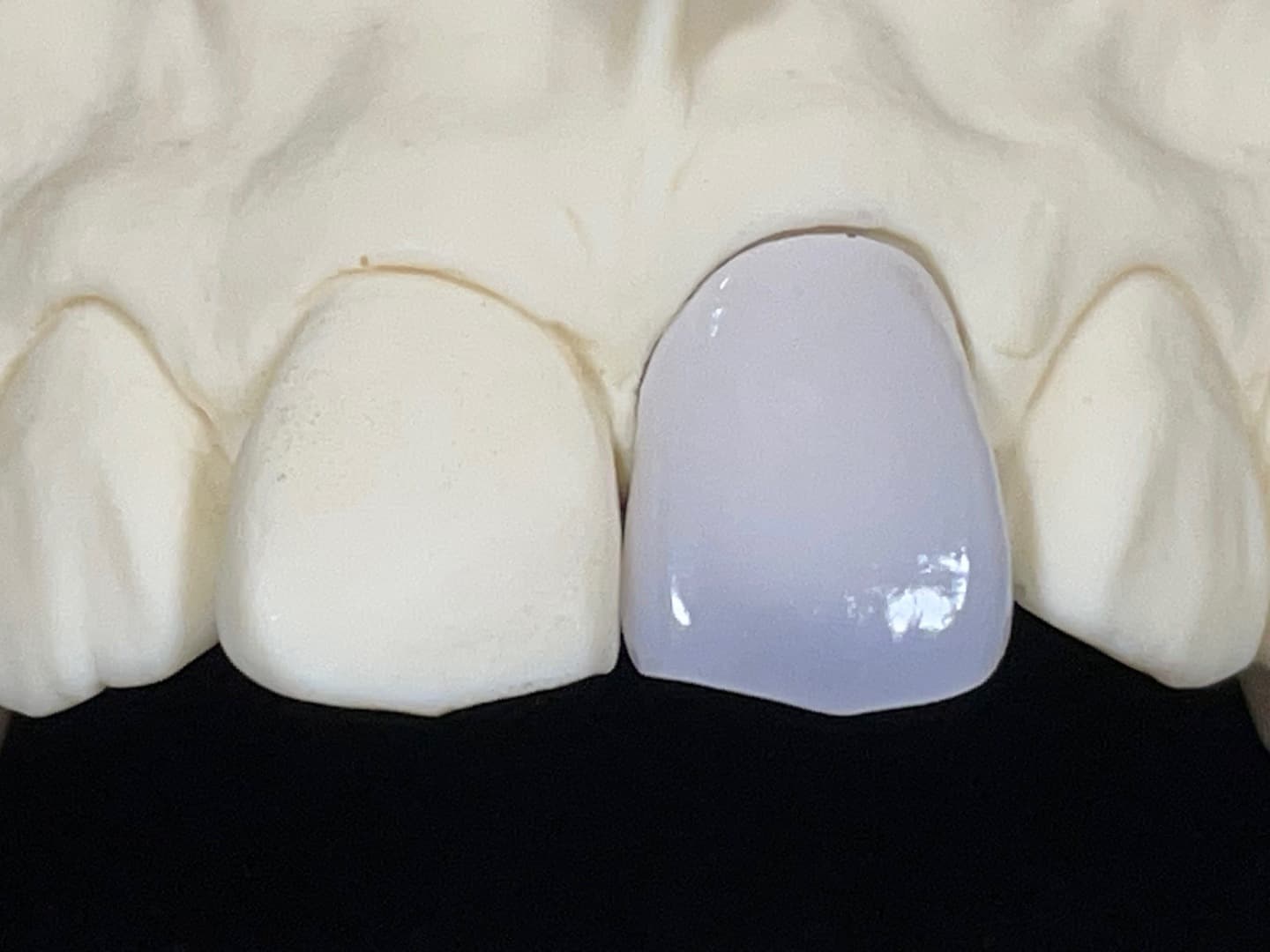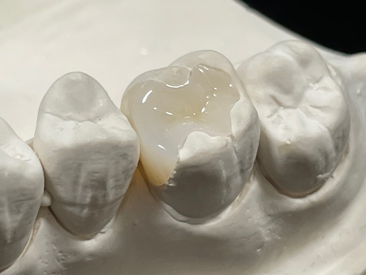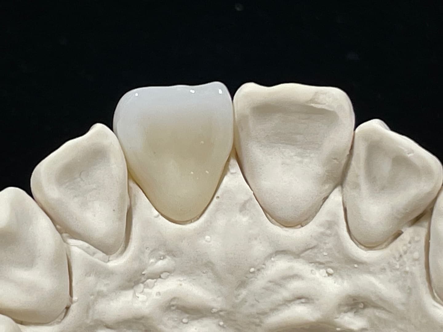とっても丈夫なガラスセラミック製です。セラミックは生体親和性がとても良い(体になじみやすい)ので、金属アレルギーの心配がありません。天然歯の色調に合わせることができます。