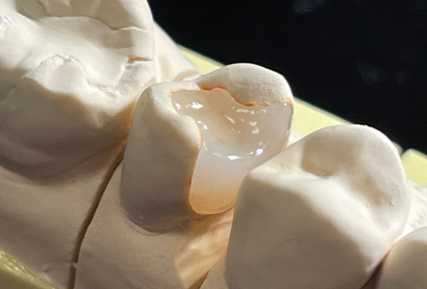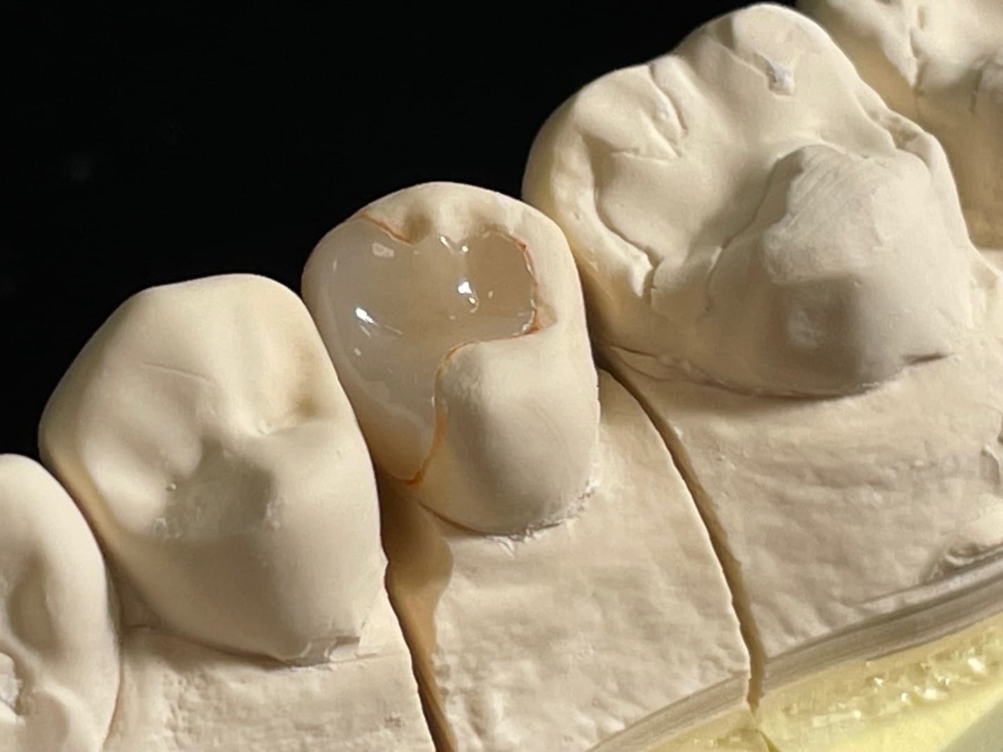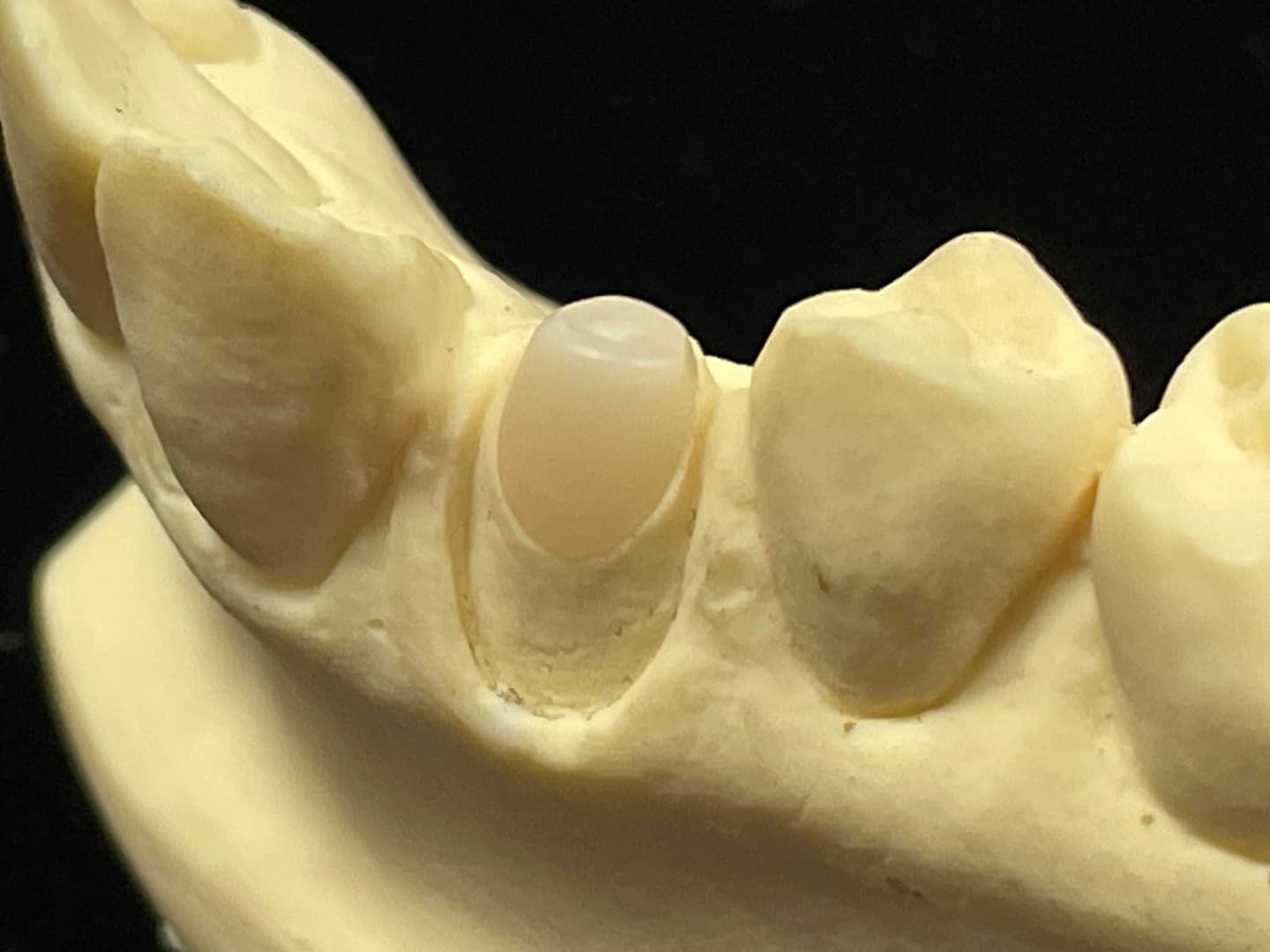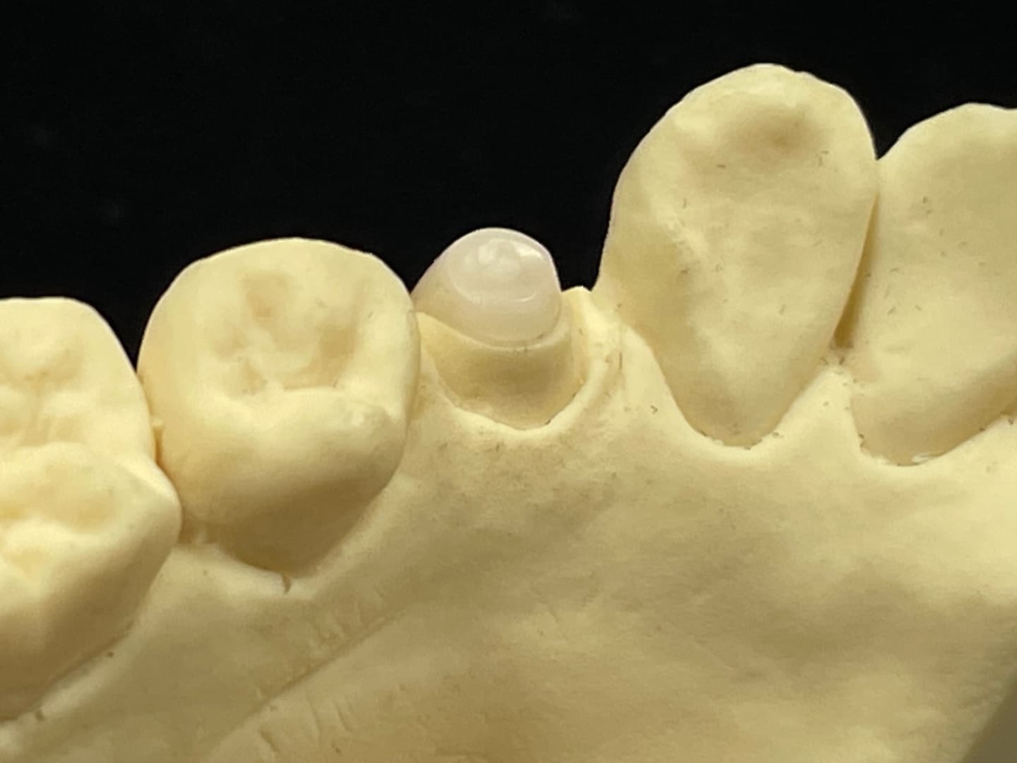 とっても丈夫なガラスセラミック製です。セラミックは生体親和性がとても良い(体になじみやすい)ので、金属アレルギーの心配がありません。天然歯の色調に合わせることができます。