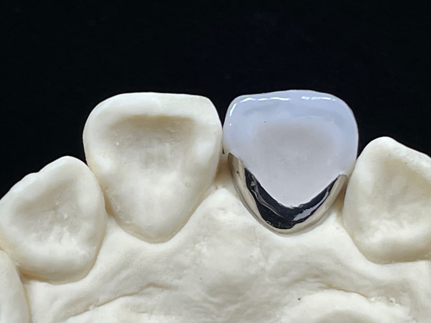 金属のフレーム(メタルキャップ)の上に、セラミック(陶材)を強固に焼き付けて成形されています。金属特有のしなやかさとセラミックの丈夫さを兼ね備えています。金属を裏うちしている関係上、色調再現性や透明感・明るさは、オールセラミックにやや劣ります。特に金属アレルギーの方は使用できません。