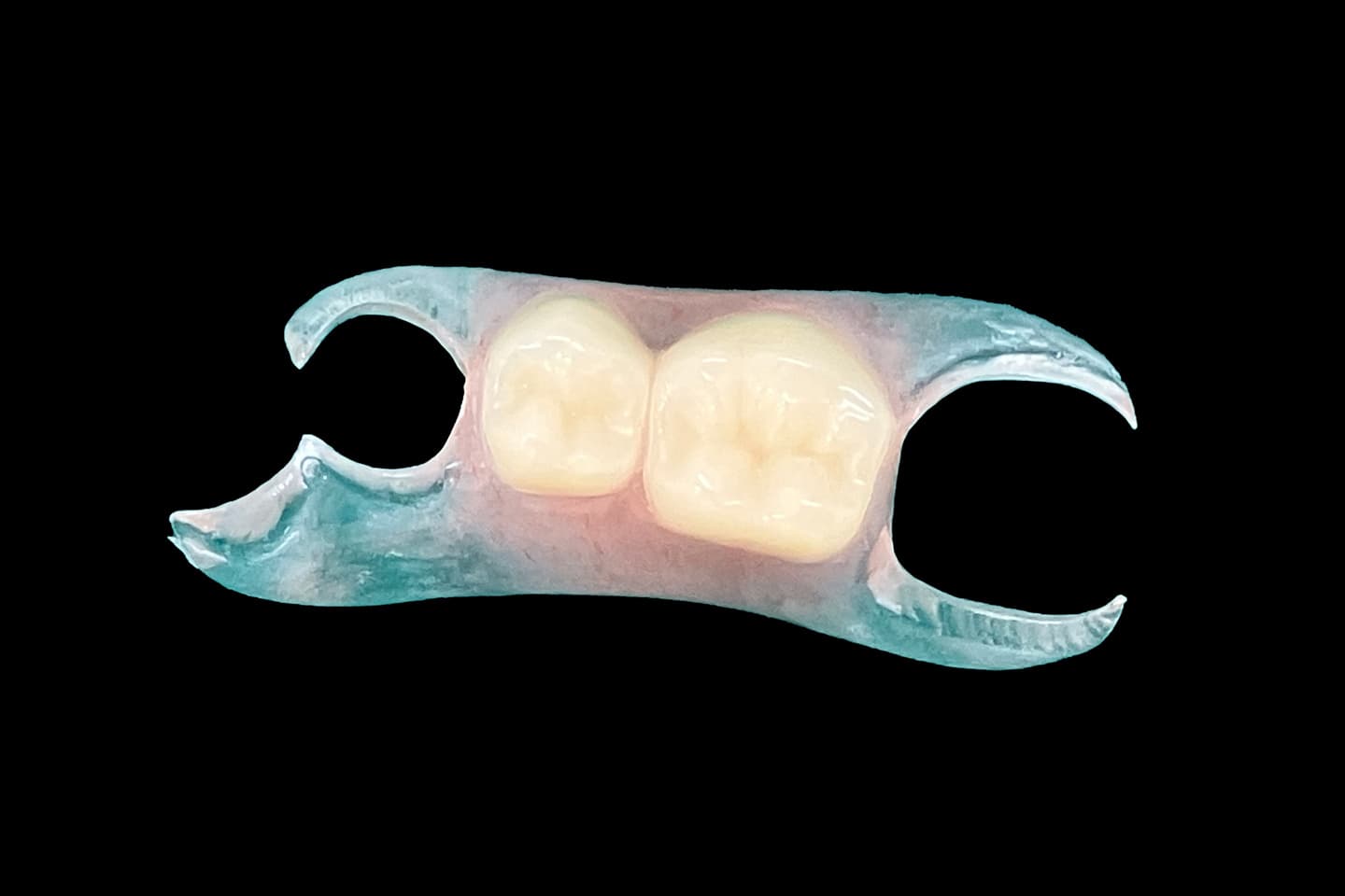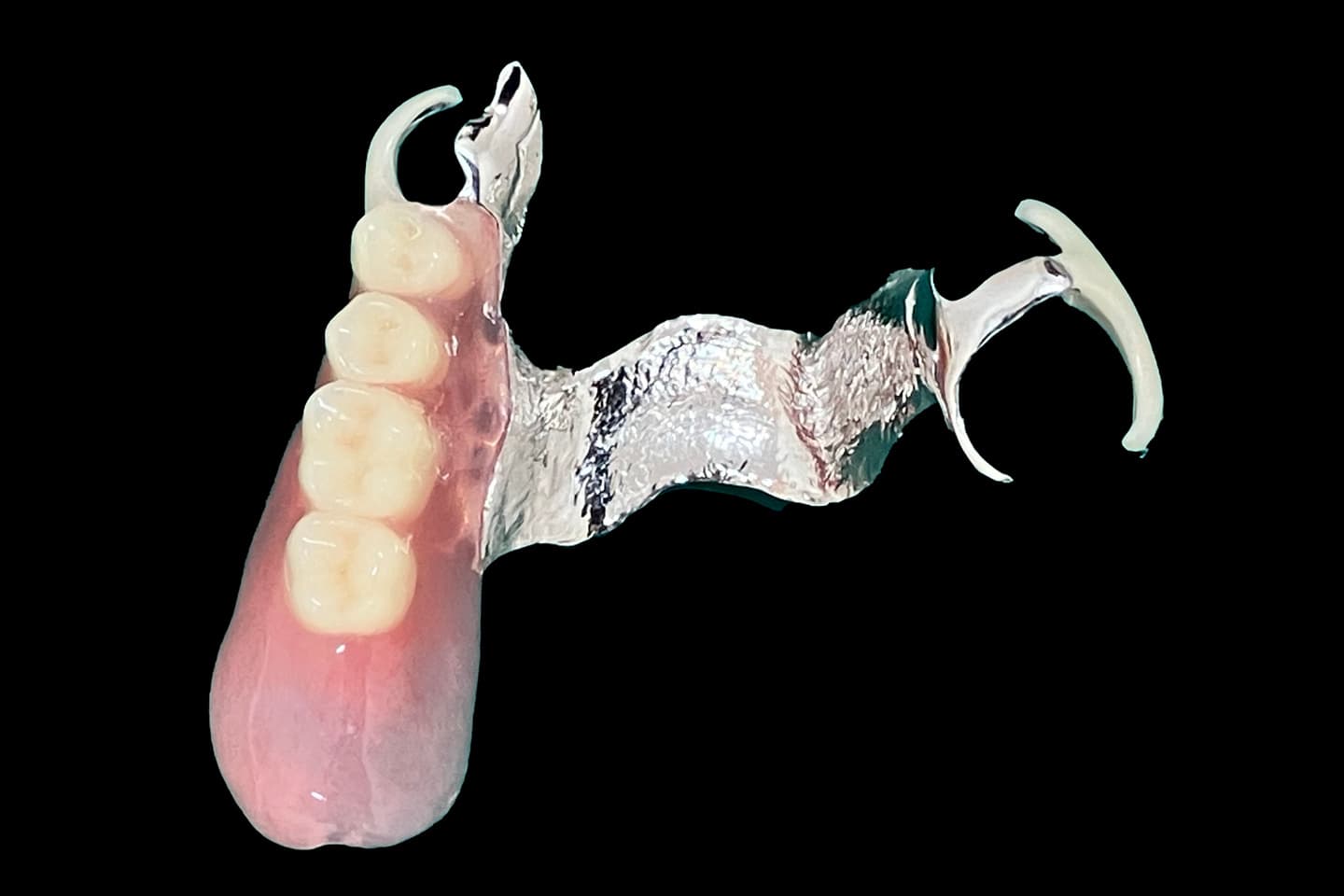 自然な見た目としっかり噛めるの両方を考慮した入れ歯で、歯の裏側の見えない部分を金属にすることで舌感が良く入れ歯がたわみません。「患者さんが入れている事を忘れるような入れ歯」を目指し作製しています。