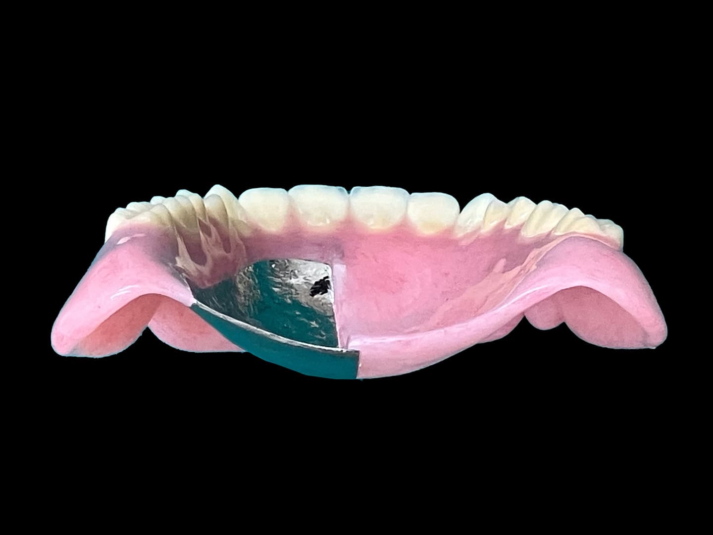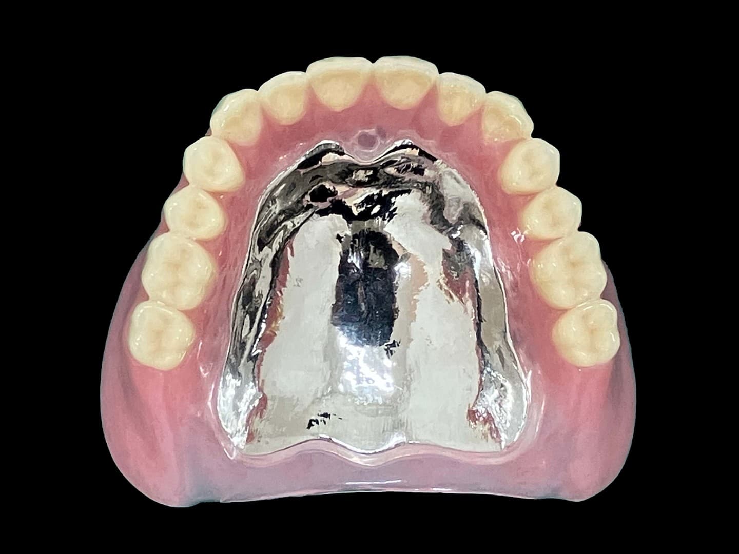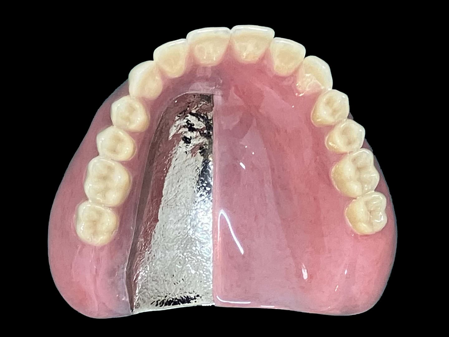 中央部分をコバルトのメタルプレートにすることで、アクリルの1/3の厚さまで薄くすることができるので、しゃべりやすかったり、違和感が少なかったりします。アクリル床(保険適用の義歯)に比べて薄くて丈夫です。コバルトの材質はロングセラーであることから安心です。